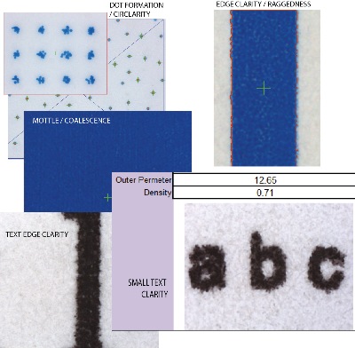 • Dot quality (dot gain, dot shape and placement) • Line and edge quality (width, blurriness, raggedness, contrast, fill and darkness – ISO13660)• Text quality (stroke quality, fidelity, uniformity)• Color adjacency and inter-color bleed• Image noise (graininess and mottle – ISO13660)• Banding, streaking, … (NPS – Noise Power Spectrum) • Inkjet satellites, voids, ghosting • Density deviation – across web • Reproducible color gamut • Plotted color gamut- for comparison • Paper curl- based on coverage/side to side. • Paper cockle – based on coverage. • Show-thru – density or L* • Small sample uncoated paper- of the above• Ink adhesion